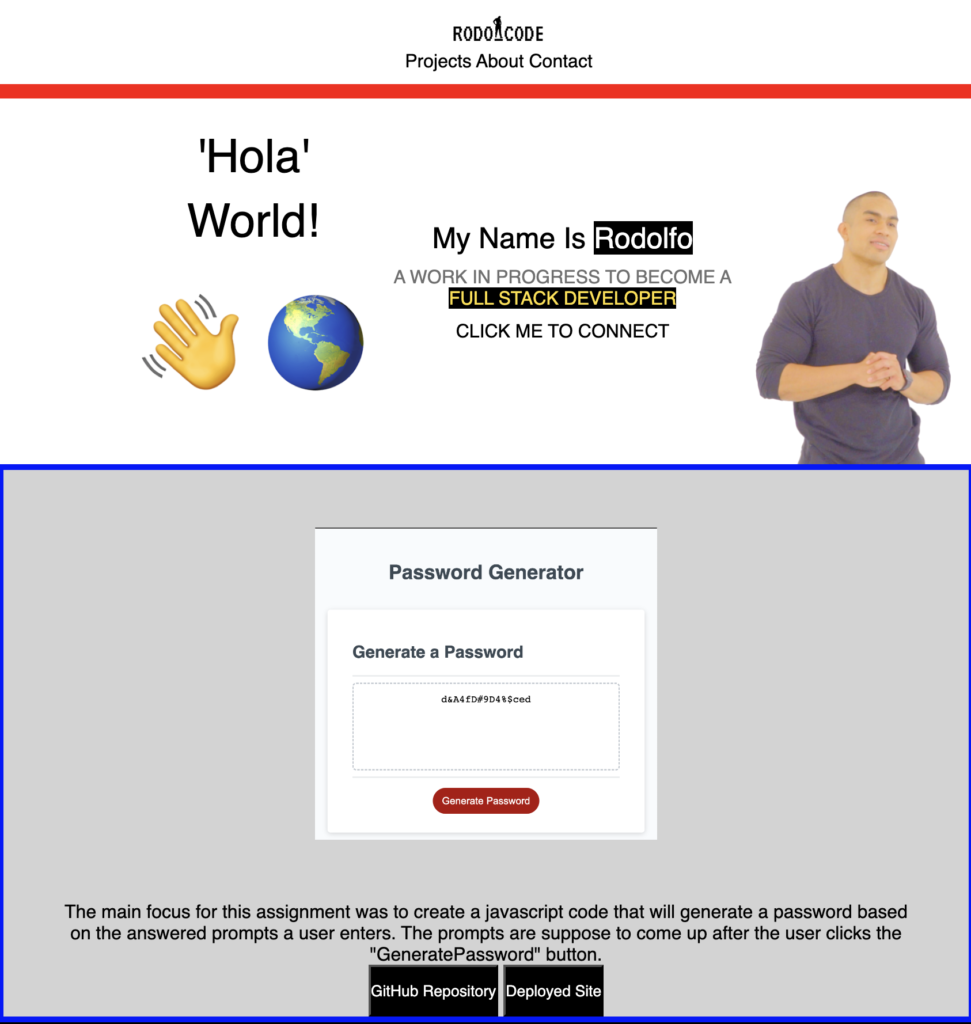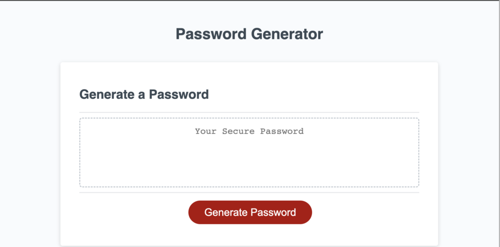 The primary goal of this project was to create a JavaScript code that generates a password based on the user’s input. Prompts appear after the user clicks the ‘Generate Password’ button.