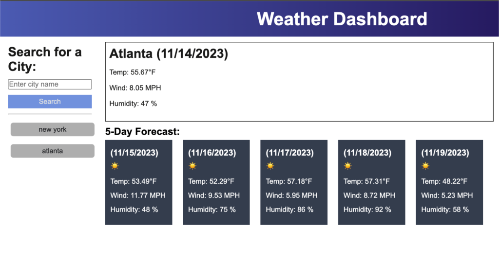 This weather dashboard utilizes the OpenWeatherMap API to display current weather conditions and a 5-day forecast. The dashboard includes a search bar that saves the history of previously searched city names, allowing for quick access to past weather data.