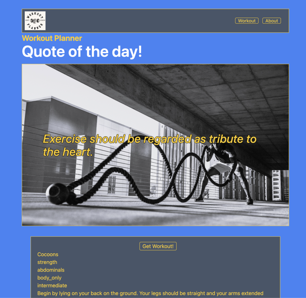 This project utilized APIs, JavaScript, HTML, and CSS (with Tailwind). The planner is designed to quickly provide a random workout for your core, upper body, or lower body, while also saving the last workout completed for each body section.