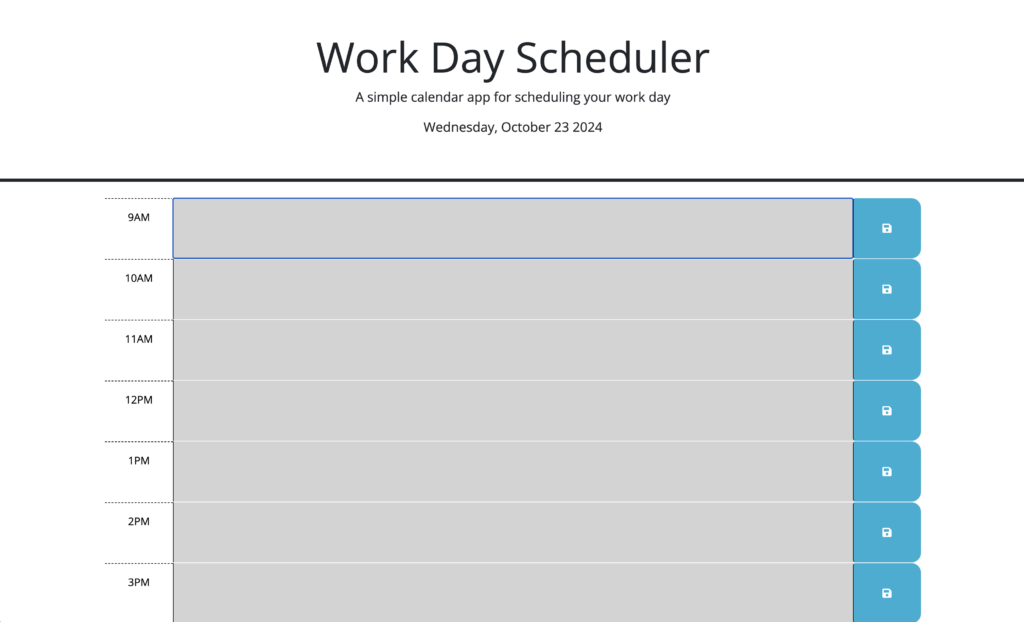 This project was built using JavaScript and local storage. Starting with provided code, the objective was to implement logic using DayJS to set the background color of each time section based on whether it is in the past, present, or future. Additionally, local storage was used to allow users to input events in specific time slots, ensuring that the information persists even after a page reload using localStorage.getItem. Users can also change or update events. The current day is displayed at the top, just below the title.