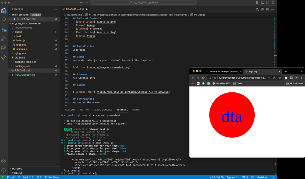The motivation for this project was to deepen my understanding of Node.js by implementing new concepts. We built this project to learn how to create files, work with class constructors, utilize npm packages, and adopt new best practices with Node.js. The project addresses the need for a simple tool to create SVG files with customizable text, text color, and a choice of three different shapes and their colors. Throughout the development process, we gained experience in file creation, using classes, leveraging npm packages, and understanding what a standard test setup looks like.