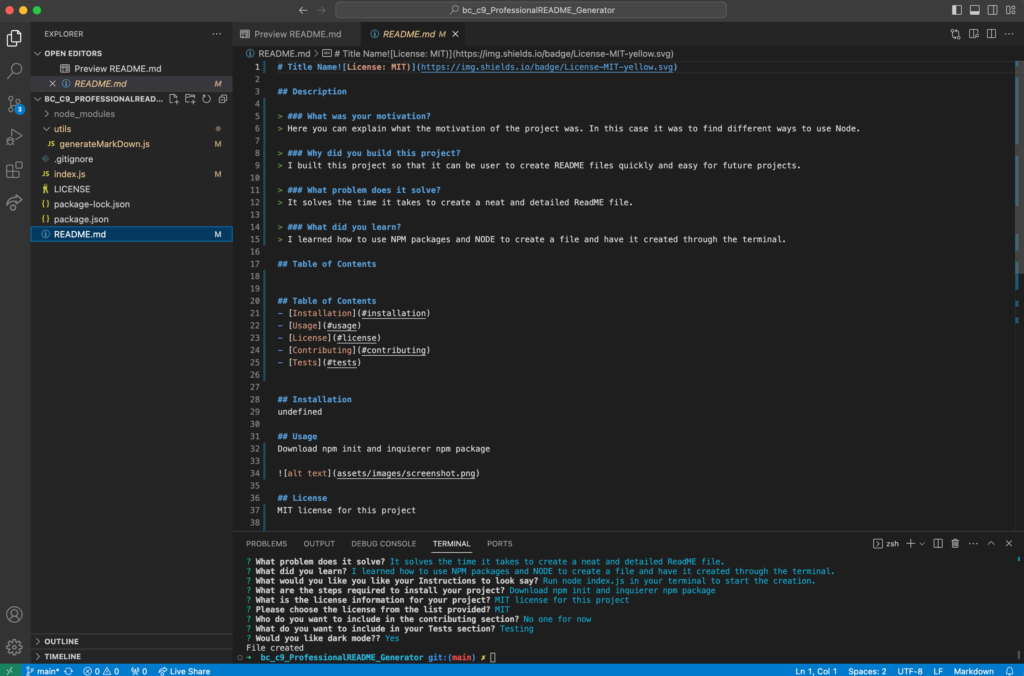 The motivation behind this project was to learn how to use Node and create files effectively. I built this project to develop a README generator tool that can quickly organize and produce a professional layout for README files. This tool solves the problem of streamlining the creation process, making it quick and easy to generate a well-structured README. Throughout the project, I learned how to use Node and download npm packages, such as Inquirer, and successfully integrate them into the project.